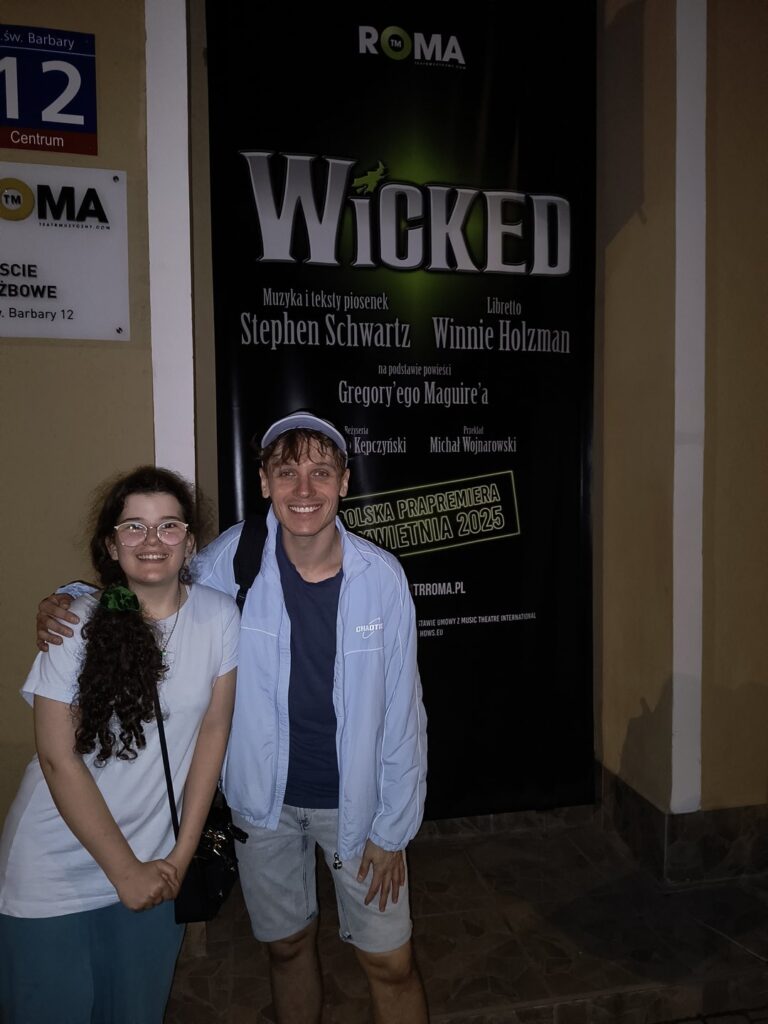 5.06.2025 r. odwiedziliśmy Warszawę, gdzie w Teatrze Muzycznym „ROMA” obejrzeliśmy musical pt. „Wicked”. Po spektaklu udało mi się zrobić zdjęcie z aktorem Marcinem Francem grającym główną rolę. Kategorie: Musicale Tagi: Maciej DybowskiMarcin FrancMaria TyszkiewiczTeatr Muzyczny "ROMA" w Warszawie